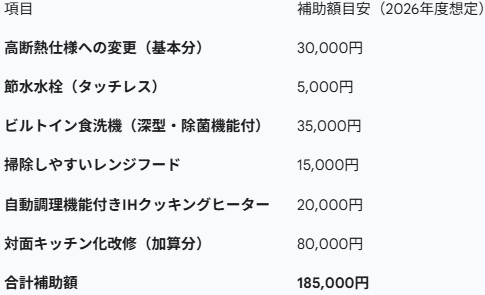 キッチンの位置を壁付けからリビング向きの「対面式」に変更する場合、2026年度は「子育て・多世代交流促進」の観点から、さらに加算が受けられるケースがあります。これらを組み合わせることで、キッチンリフォーム単体でも10万円〜20万円、他の窓断熱などと合わせれば最大100万円近い補助を狙うことも夢ではありません。