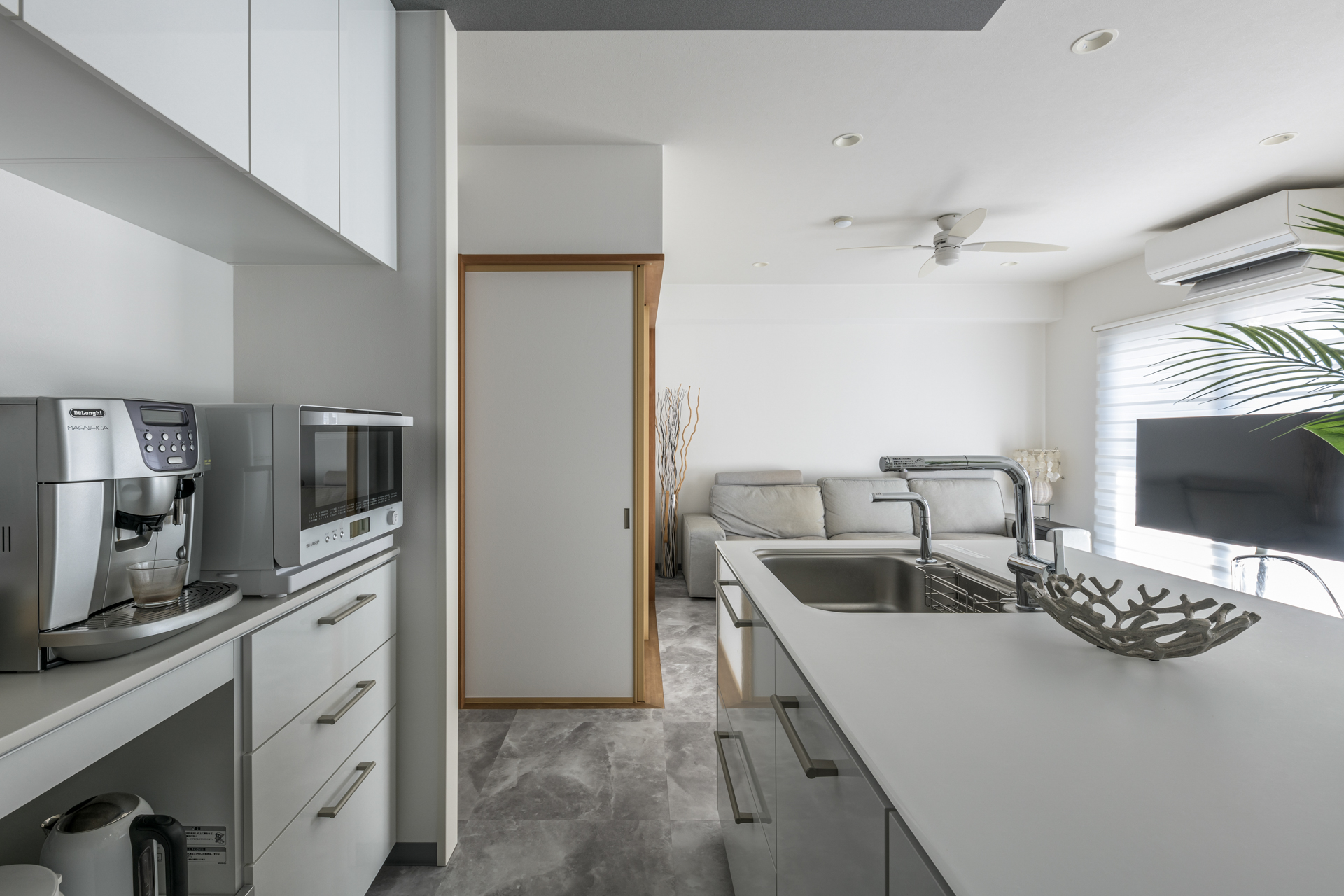 カップボードとキッチンの通路幅を確保する為に壁をセットバックしました。