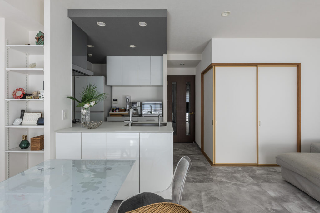 暗さを解消する為に部屋を仕切っていた壁を撤去し、対面式キッチンにすることで、明るく開放的な空間設計にしました。